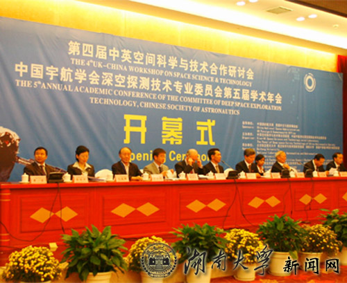 湖南大学校长、中国工程院院士钟志华教授和英国卢瑟福-阿普尔顿实验室空间技术实验室主任、英国皇家工程院院士Richard Holdaway教授担任大会联合主席。国家航天局系统工程一司田玉龙副司长和英国驻华大使馆特派代表Ms. Zaman分别代表中英双方致欢迎词;教育部科技司副司长陈盈晖、国家自然科学基金委信息学部副主任张兆田等与会并致辞。会上,探月工程总设计师吴伟仁做了“深空探测与探月工程”的大会报告;我校校长钟志华院士做了“四轴三轮月球车”的大会报告,报告内容受到了参会代表和媒体的高度关注与好评。大会开幕式由我校副校长曹一家主持。